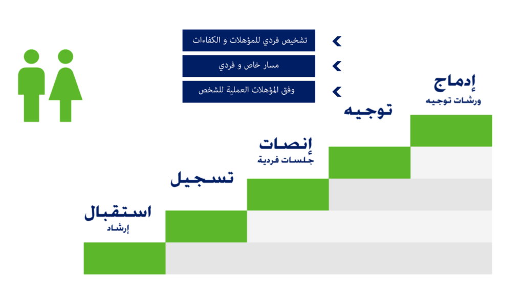• مواكبة الشباب عن طريق مقابلات فردية من أجل صياغة ملفهم الشخصي وتطلعاتهم لمساعدتهم في تحديد مشروعهم المهني وتمكينهم من تحقيقه وإنجاحه.